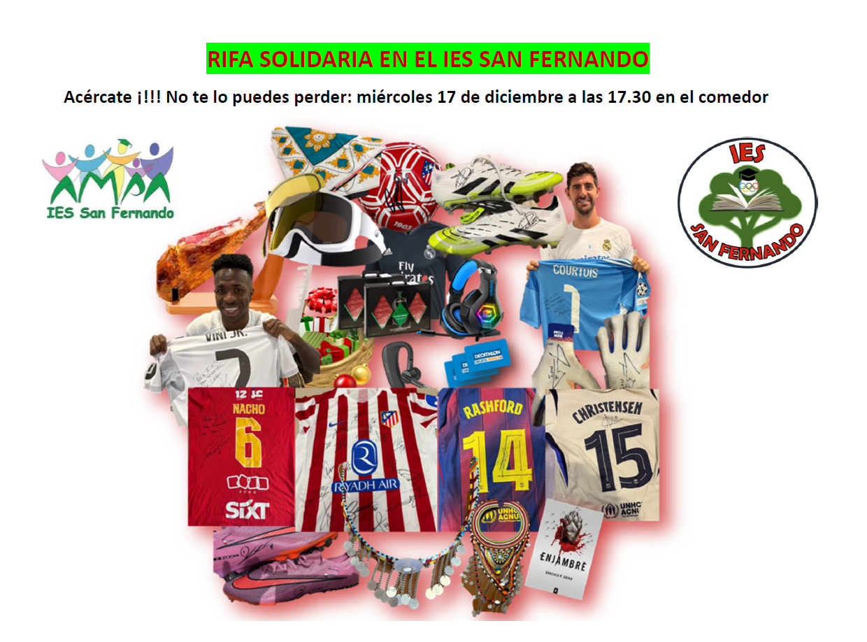 Rifa Solidaria 2025 por IES San Fernando | Dic 12, 2025 | Últimas noticias | 0 Comentarios Como todos los cursos vamos a realizar nuestra rifa solidaria.